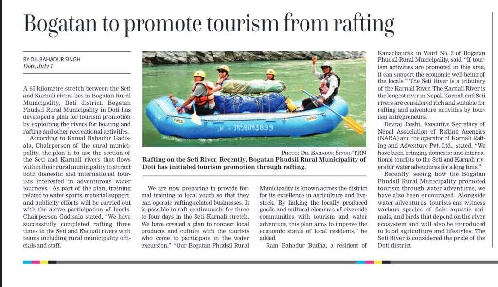 A 65-kilometre stretch between the Seti and Karnali rivers—rich in natural beauty and adventure potential—is now the focus of a comprehensive tourism development plan aimed at drawing domestic and international adventure seekers. This initiative, spearheaded by the local government, aims to make Bogatan a premier destination for rafting, boating, and river-based recreation, while empowering local communities economically and culturally.
